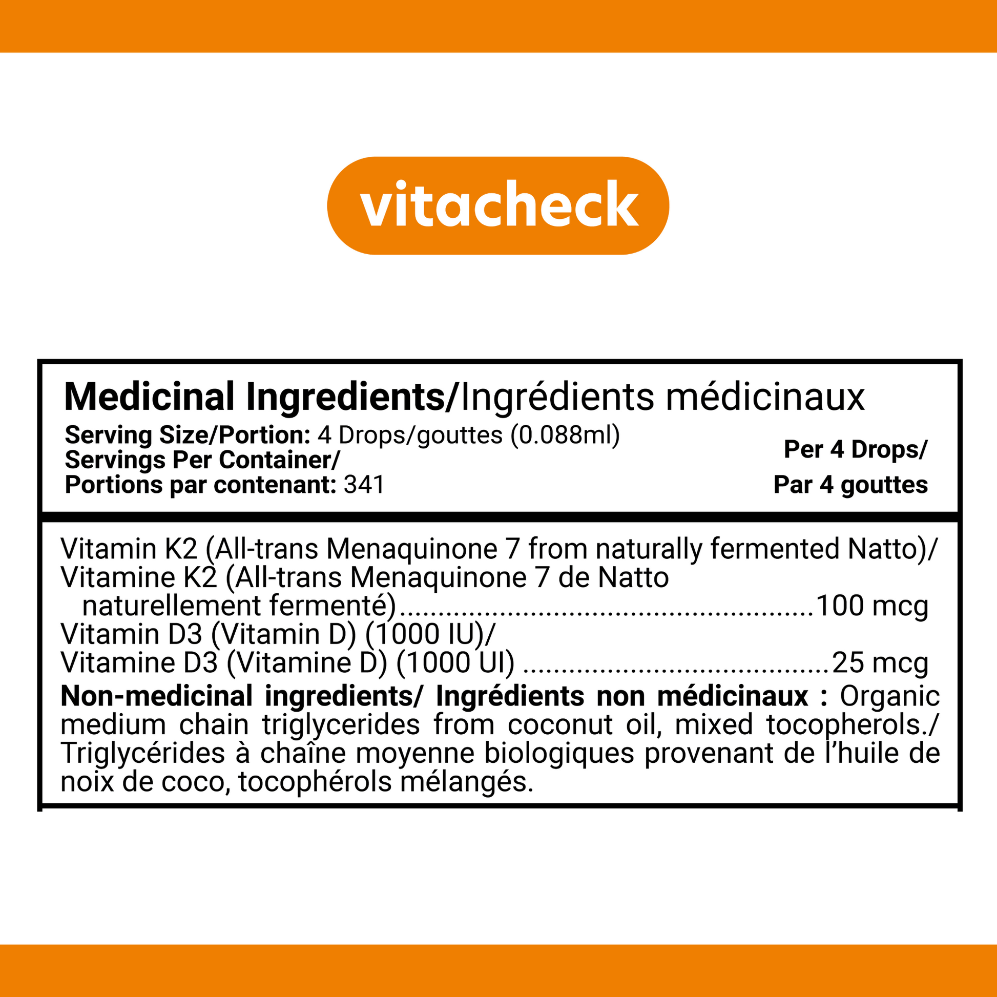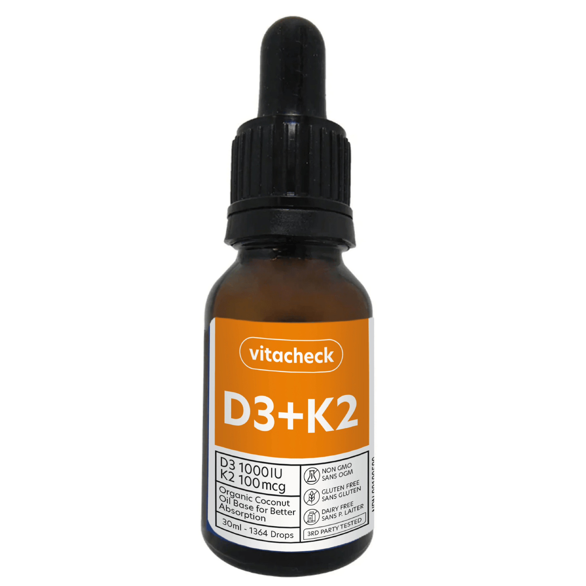 Feel your best every day with Vitacheck D3 + K2 Drops. This powerful formula combines 1000 IU Vitamin D3 and 100 mcg Vitamin K2 in organic MCT oil to support bones, heart, and immune health. Vegan, non-GMO and proudly made in Canada.