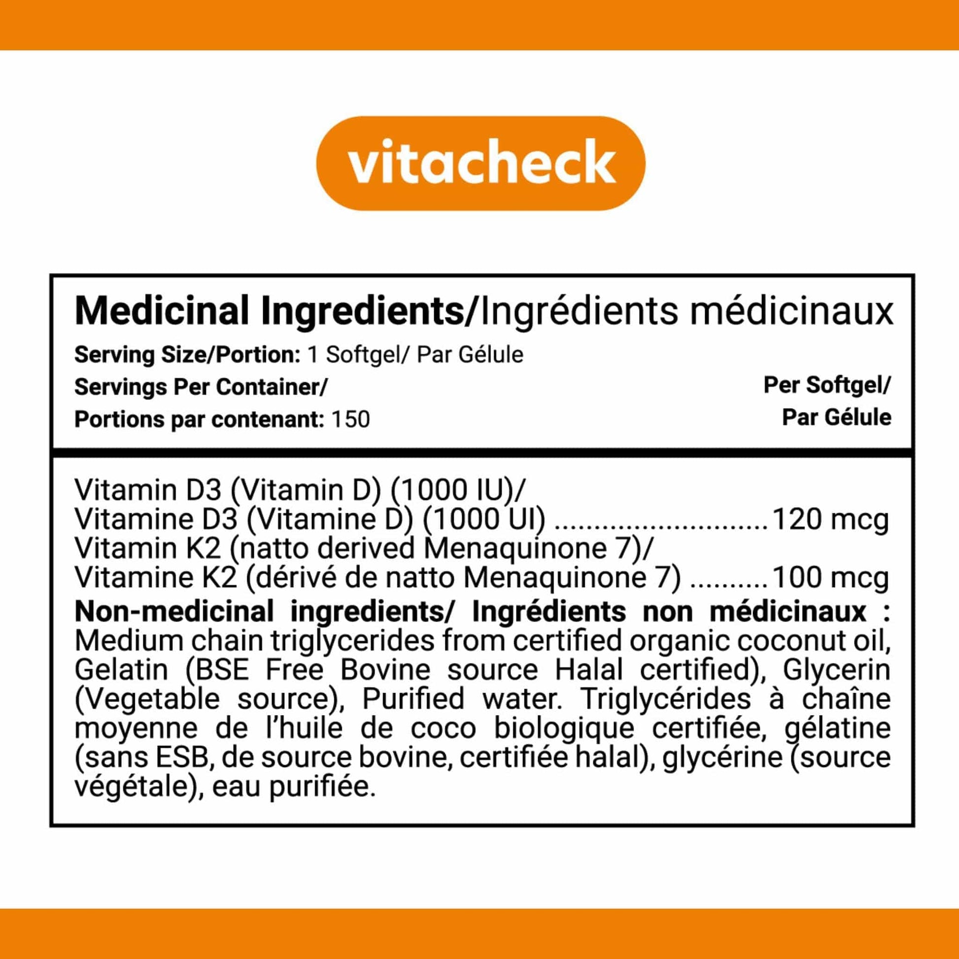 Vitacheck Vitamin D3+K2, 1000IU D3 and 100mcg K2, In Organic Coconut Oil for Better Absorption, Supports Bone and Heart Health, 150 Softgels