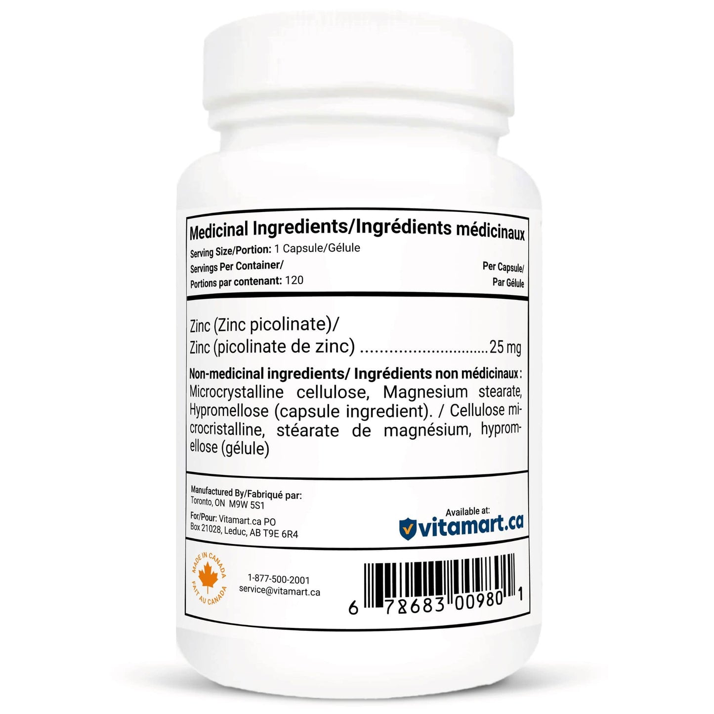 Vitacheck Zinc Picolinate 25mg Extra Strength, Chelated, Immune Health, Energy Metabolism, Hair and Nail Health, 120 Vegetable Capsules