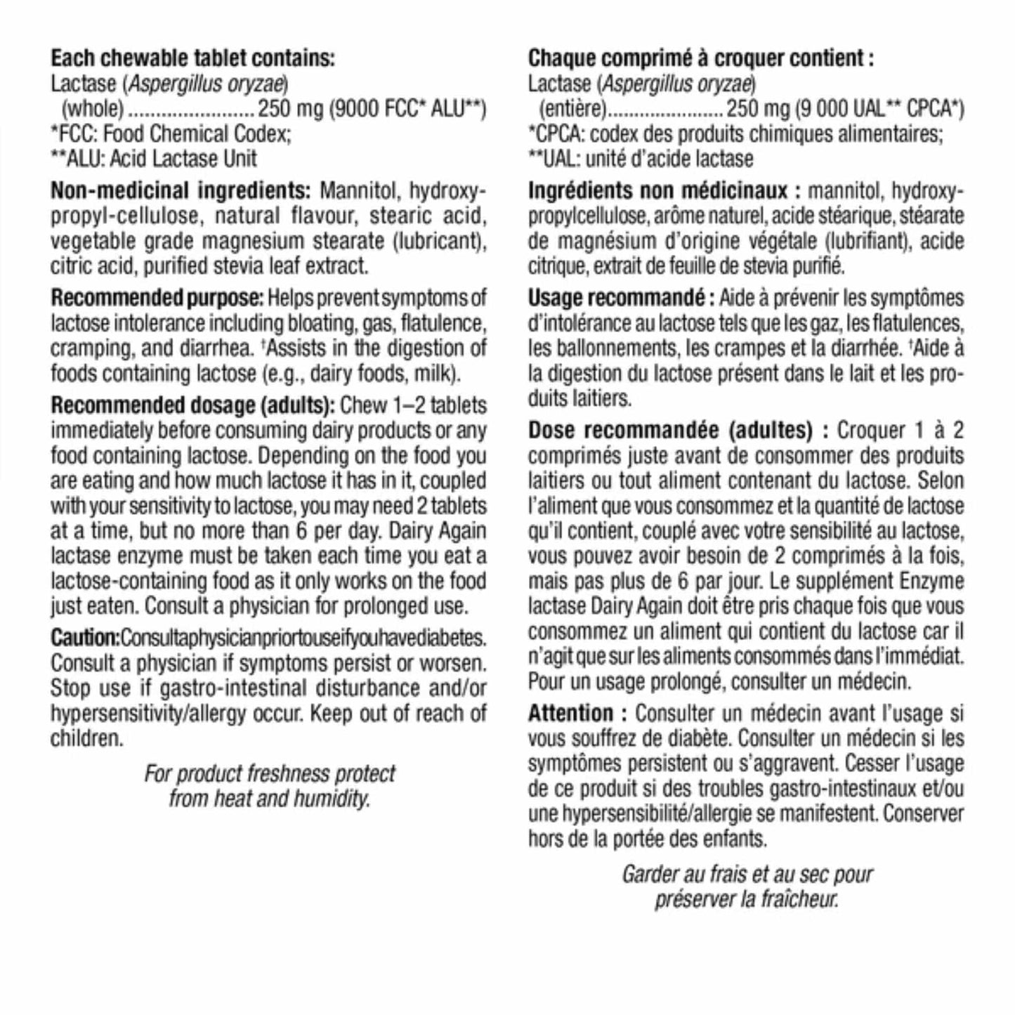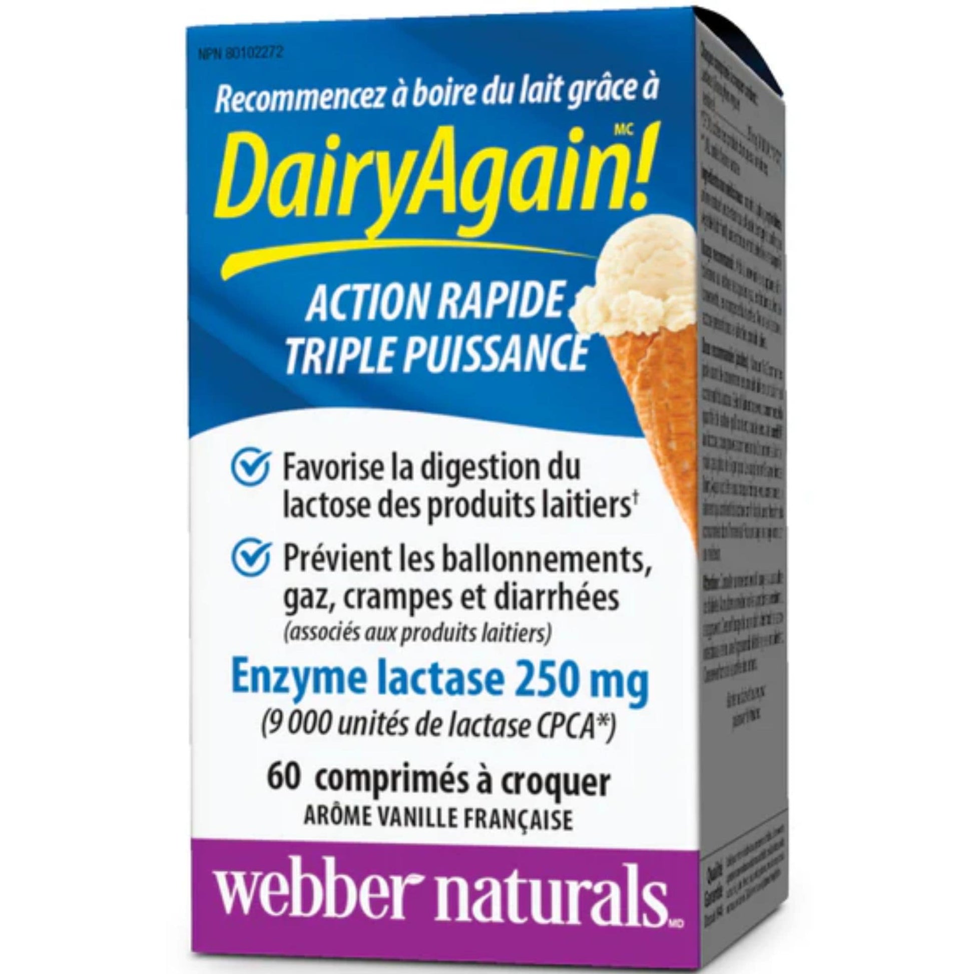 Webber Naturals Dairy Again provides fast-acting relief from lactose intolerance symptoms with 9,000 FCC lactase units per chewable tablet. Enjoy dairy without discomfort!