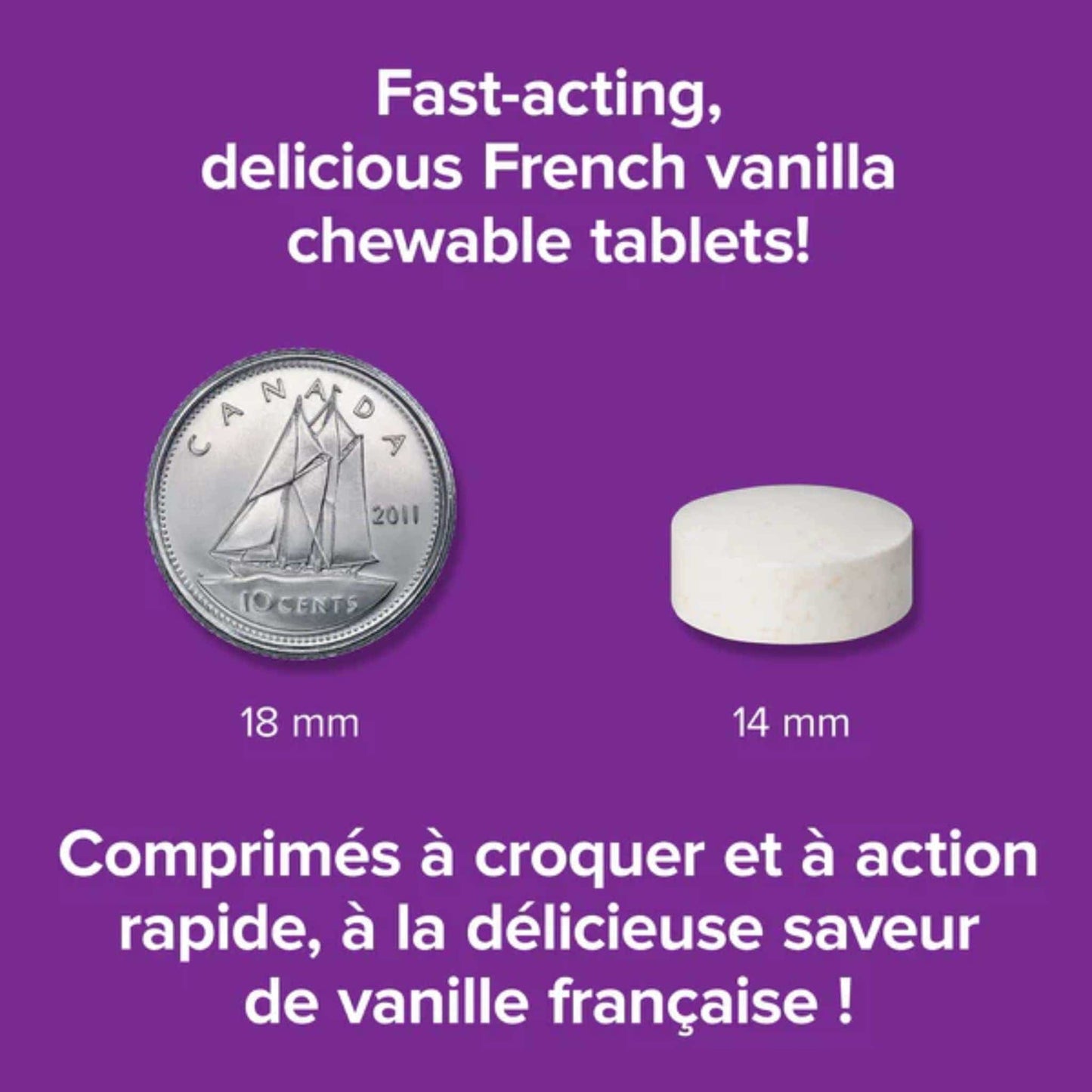 Convenient Chewable Tablets: Delicious French-vanilla flavor makes it easy to take, no water required.