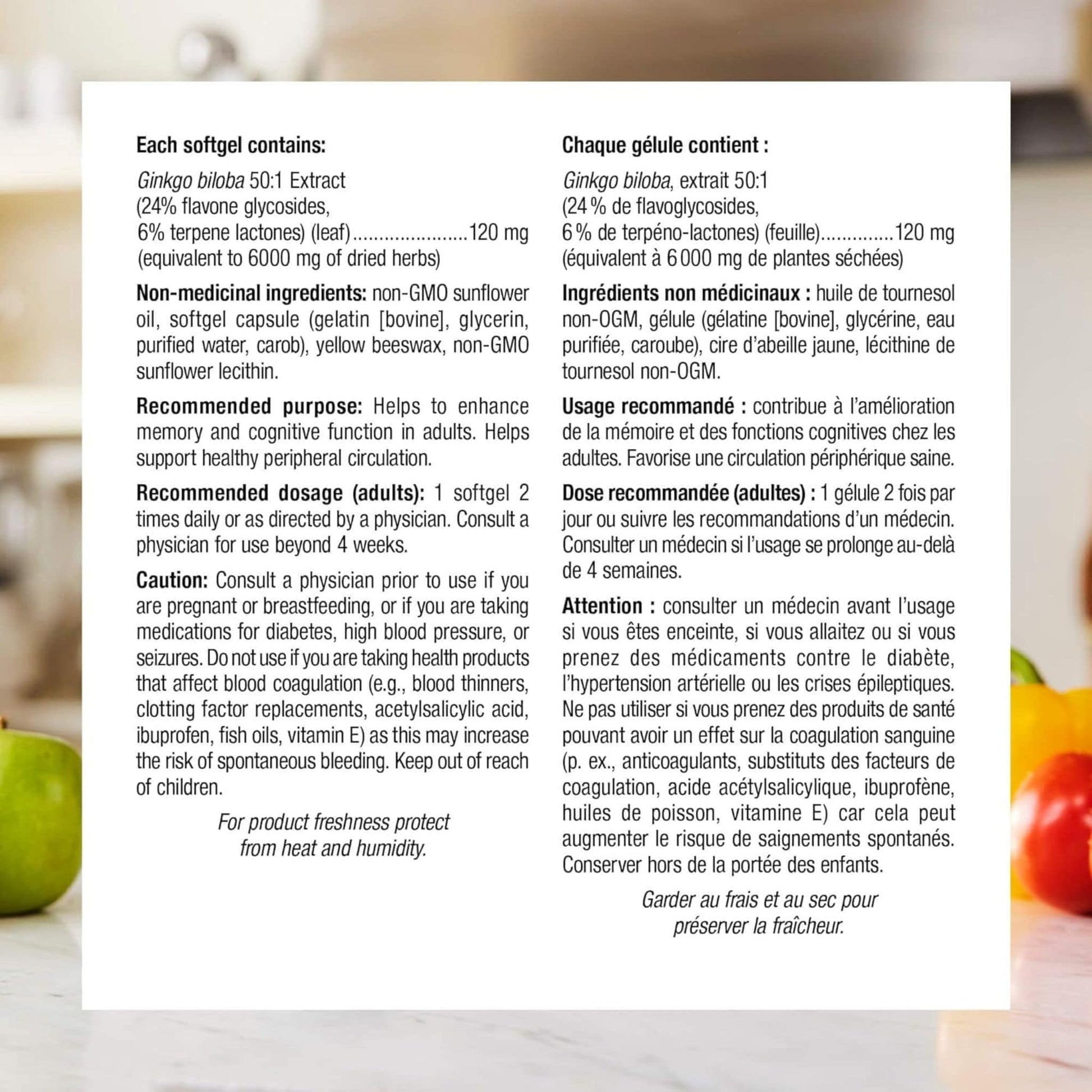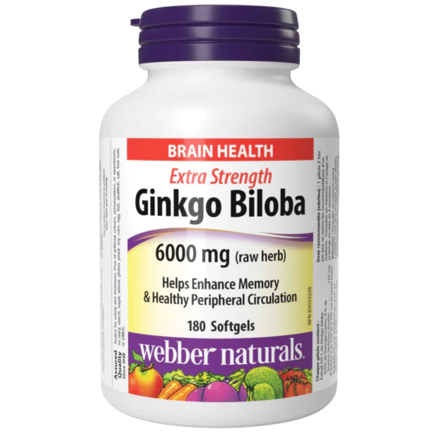 Webber Naturals Ginkgo Biloba 6000mg Extra Strength softgels provide enhanced memory, cognitive function, and healthy peripheral circulation. This gluten-free, non-GMO formula contains a standardized 50:1 extract with 24% flavone glycosides and 6% terpene lactones.