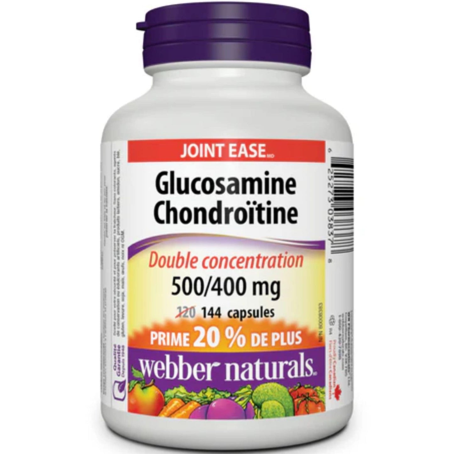 Webber Naturals Glucosamine Chondroitin Sulfate, Double Strength, 500mg/400mg, BONUS SIZE 20% More, 120+24 Capsules