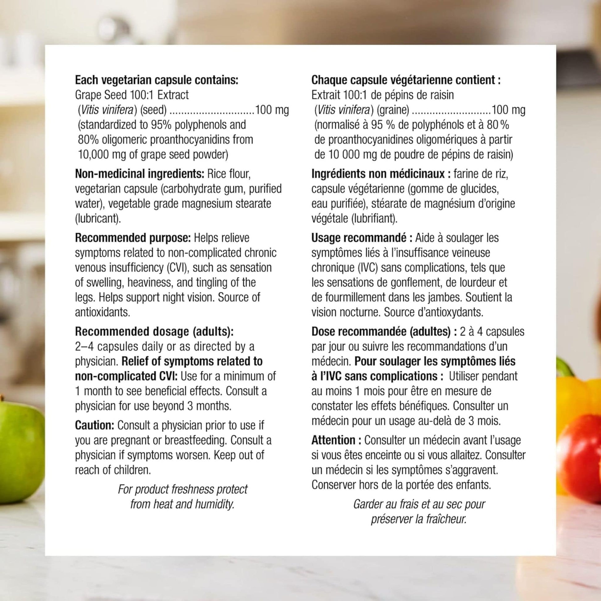 Webber Naturals Grape Seed Extract is a powerful antioxidant that supports vein health and night vision. Each capsule provides a 100:1 extract, equivalent to 10,000 mg of grape seed powder, helping to relieve symptoms associated with chronic venous insufficiency (CVI) such as leg swelling, heaviness, and tingling.