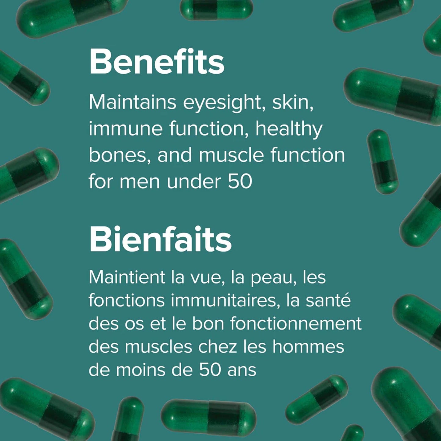 Men’s Most Complete Multi is a one-per-day formula providing 100% of recommended vitamins and minerals in a whole-food base to maintain eyesight, skin, immune function, healthy bones, and muscle function for men under 50. Each easy-to-swallow capsule features over 55 nutrients from non-GMO sources, and is suitable for vegetarians.