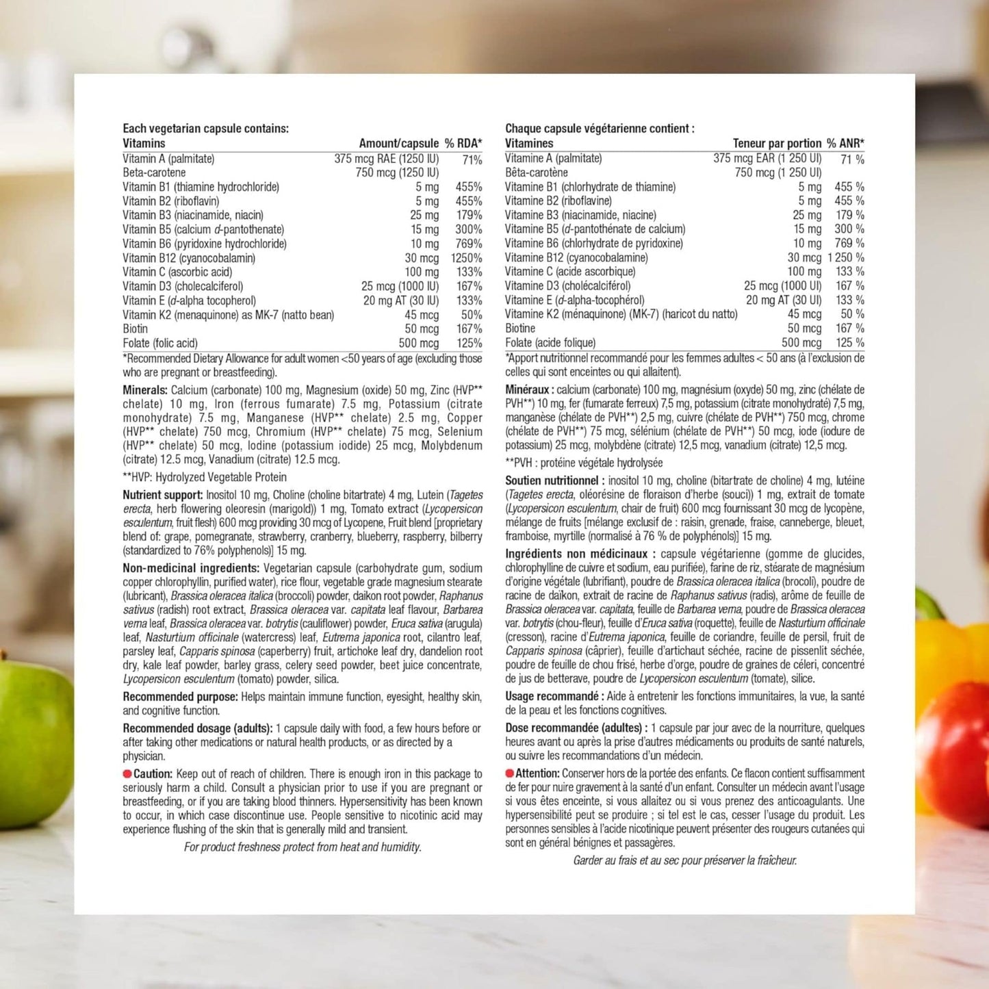 | Nutrient support: Inositol 10 mg, Choline (choline bitartrate) 4 mg, Lutein (Tagetes erecta, herb flowering oleoresin (marigold)) 1 mg, Tomato extract (Lycopersicon esculentum, fruit flesh) 600 mcg providing 30 mcg of Lycopene, Fruit blend [proprietary blend of: grape, pomegranate, strawberry, cranberry, blueberry, raspberry, bilberry (standardized to 76% polyphenols)] 15 mg. | ||