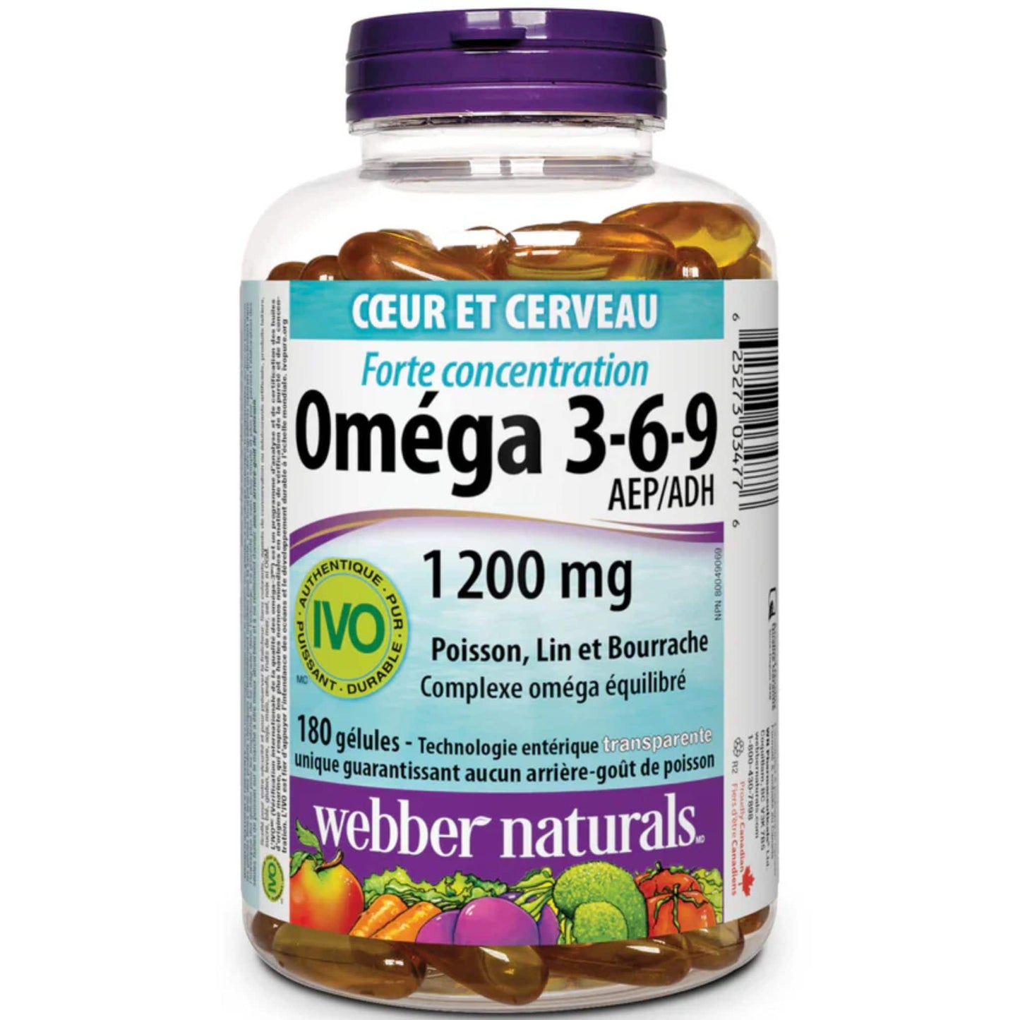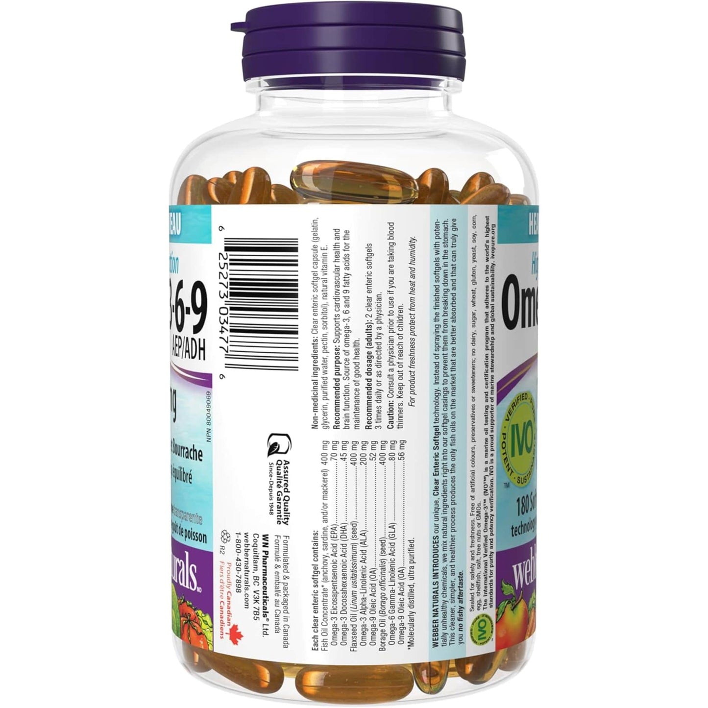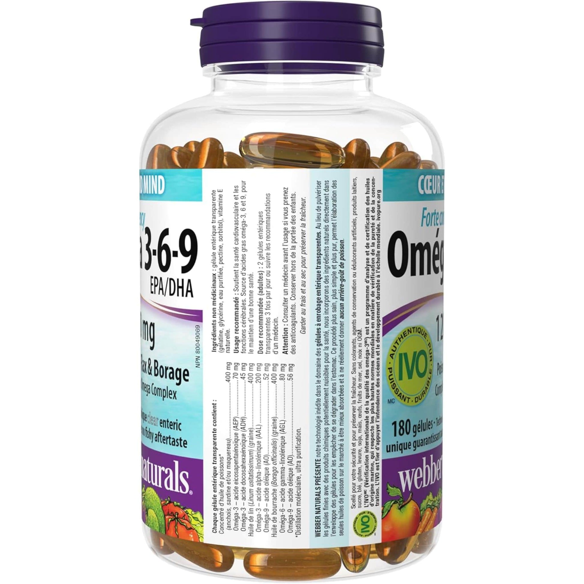 Webber Naturals Omega 3-6-9 Extra Strength 1200mg, No Fishy Aftertaste, 180 Clear Enteric Softgels