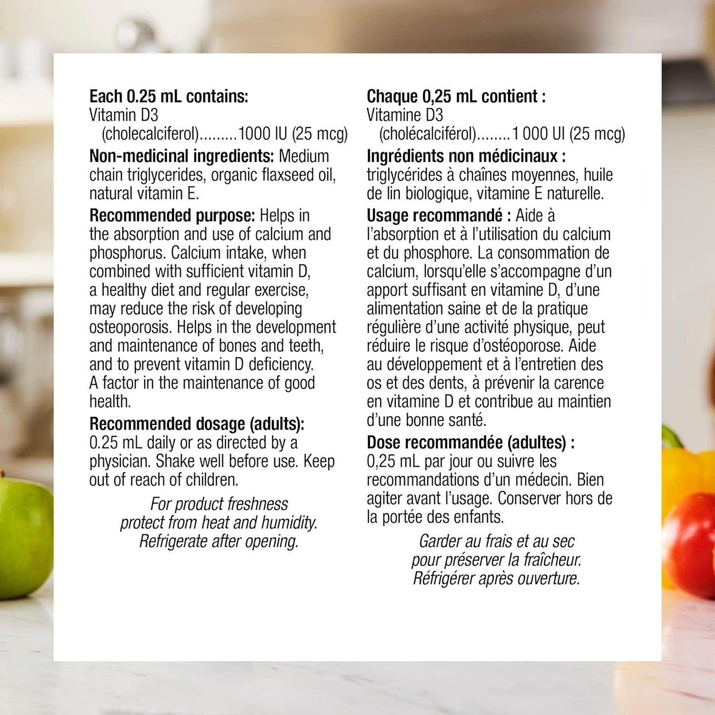 - Each 0.25 mL provides 1000 IU (25 mcg) of vitamin D3